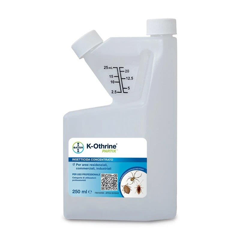 (industrie alimentari). È adatto al trattamento di insetti striscianti, come ad esempio scarafaggi, sia adulti che uova e forme giovanili, cimici dei letti, Mosche e ragni. Può essere impiegato anche in ambienti esterni per eliminare nidi di vespe appesi. Efficace fino a 12 settimane. K-Othrine Partix è disponibile nel formato da 250 ml, con dosatore di precisione.www.bayer.it